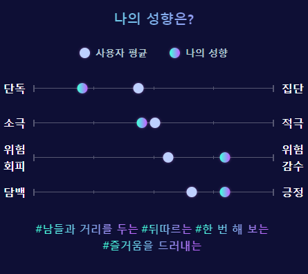 아래는 내 결과 링크다. https://poomang.com/myspectrum6/result/61821006?from_detail=True 성격 스펙트럼 테스트 ep.6 | 정서 민감도 편 나의 감정 곡선은 뜨거운 한낮 poomang.com 이 결과를 통해 내가 알게 된 +점(장점, 이미 충분한 요소)과 -점(단점, 아직 부족한 요소)을 적어보겠다. 내가 이미 충분한 것은 안정과 예민 공존 긴장감 불안정 경계심 자기애 고독을 즐김 내가 아직 부족한 것은 걱정 끊기 생각 끊기 아래 링크에 들어가면 본 테스트를 할 수 있다. https://poomang.com/myspectrum6?from_detail=True 성격 스펙트럼 테스트 ep.6 | 정서 민감도 편 나의 감정 곡선은? poomang.com '고..